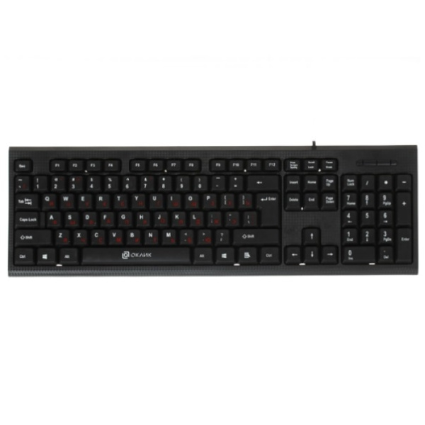 Классический офисный дизайн в черном цвете придает Oklick 120M строгий и официальный вид. Клавиши – квадратные. Двухцветный шрифт добавляет оригинальности: английские буквы – белого цвета, а русские – красного.